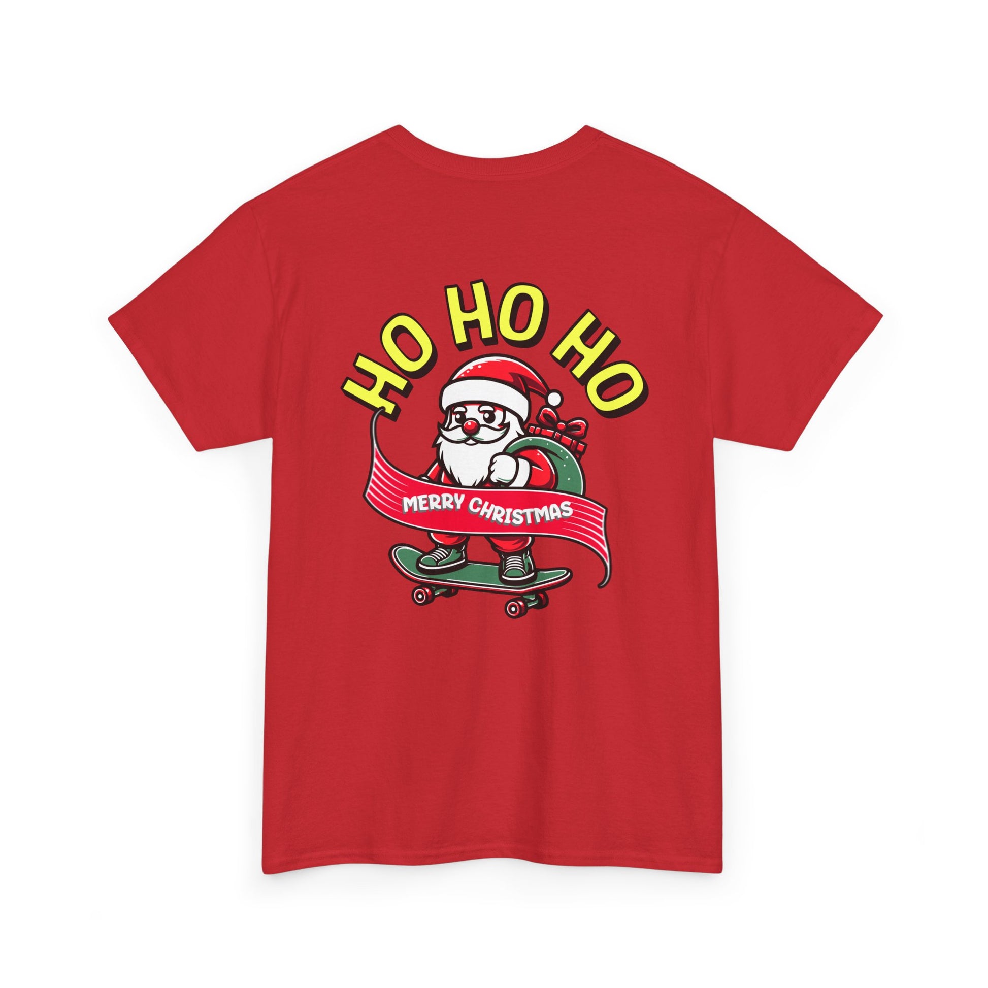 Bring fun holiday vibes with this playful skateboarding Santa tee! The front and back feature a cheerful, hand-drawn Santa illustration with festive ribbon accents for a retro-inspired look. Soft, lightweight cotton and a classic crew fit make it perfect for holiday parties, family photos, casual winter days, or layering under a jacket. Easy to style with jeans or cozy joggers for relaxed seasonal outfits.