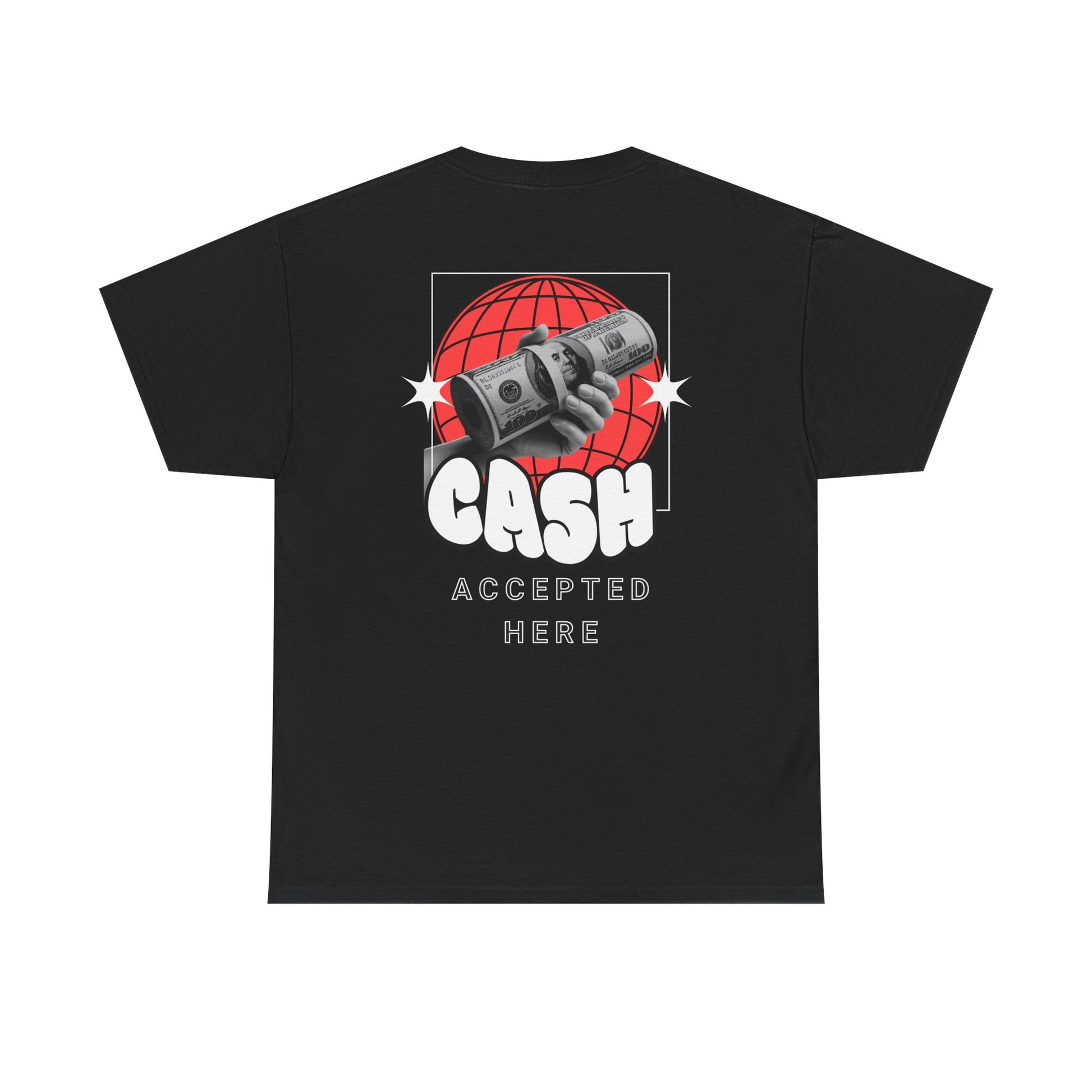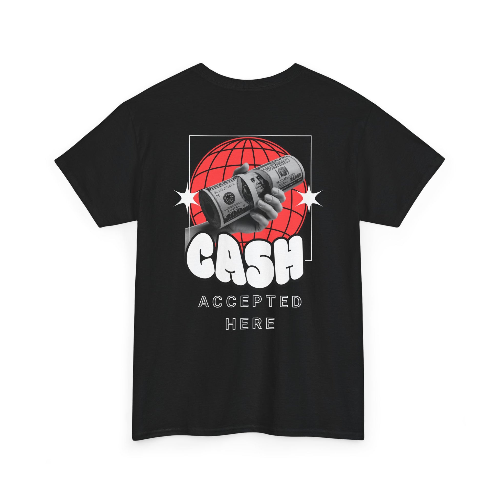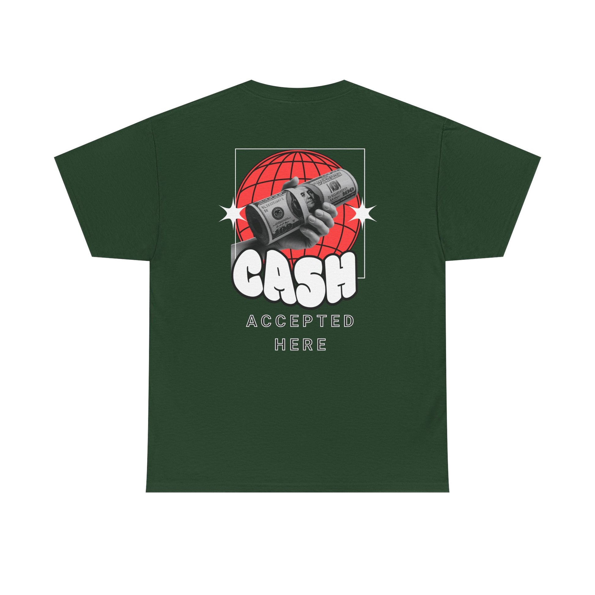 Make a statement without saying a word. This bold graphic tee features a playful hand-drawn front slogan and a retro globe-and-cash design on the back that reads “CASH ACCEPTED HERE.” Soft, durable cotton and a relaxed crew fit keep it comfortable for everyday wear, perfect for streetwear looks, hanging with friends, or adding attitude to any casual outfit. Easy to layer, easy to style, and made for confidence.