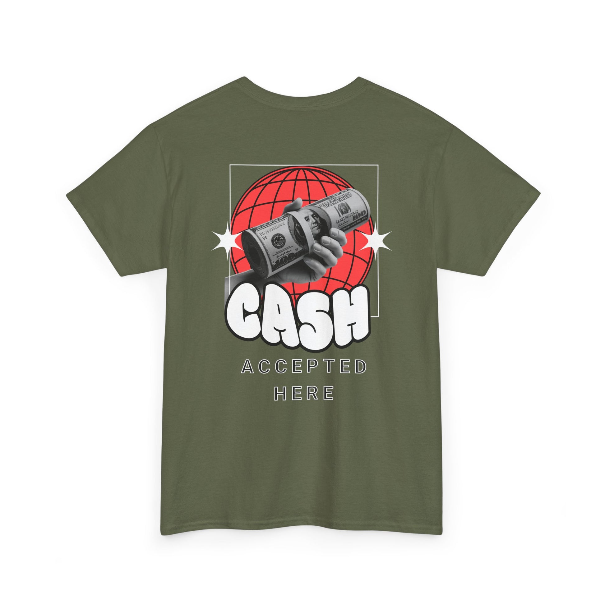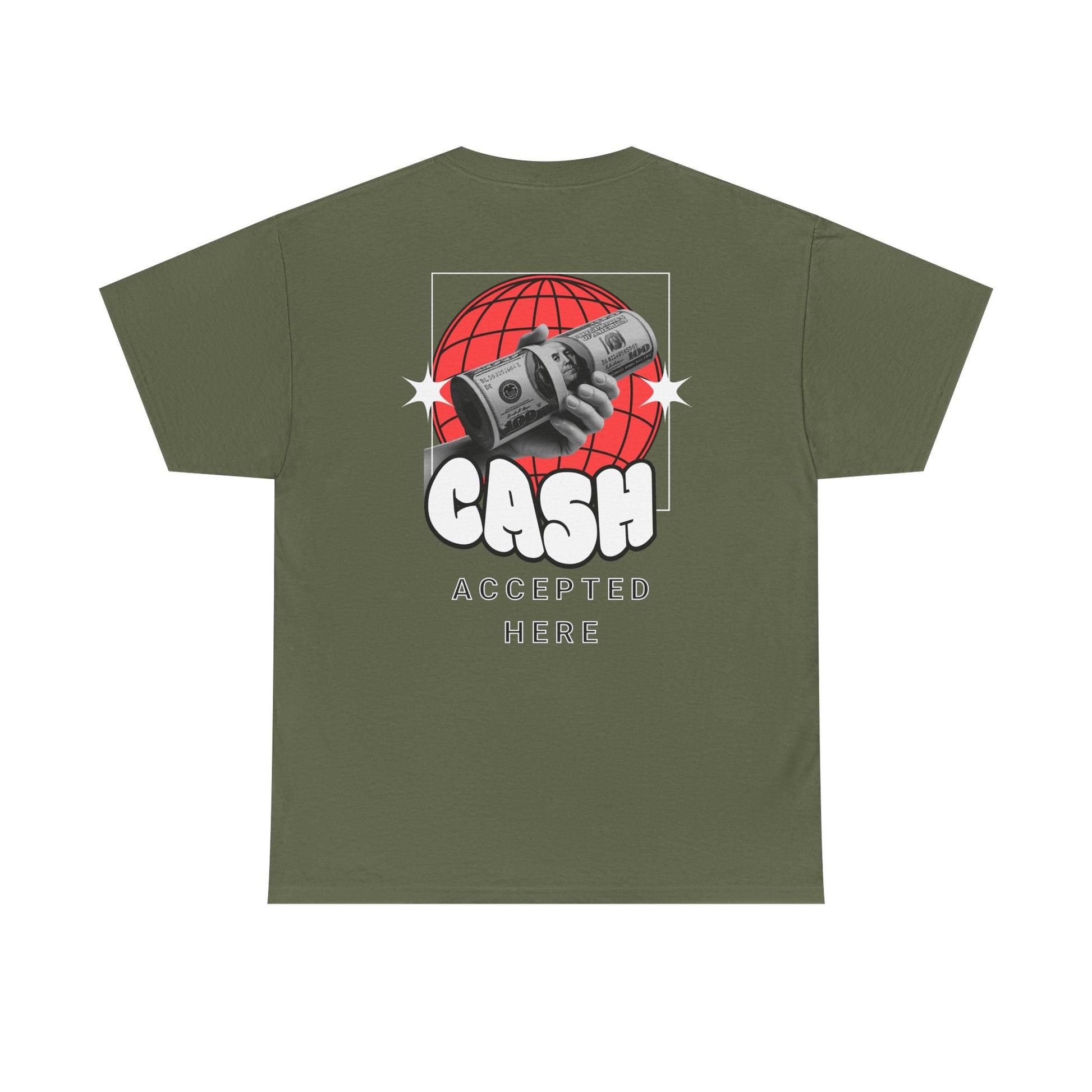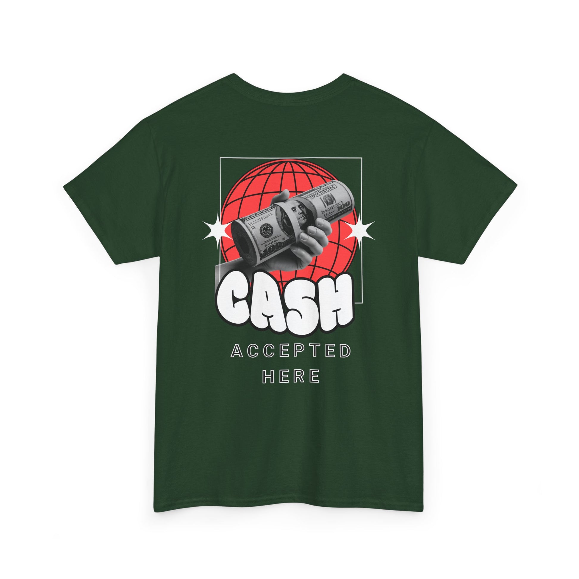 Make a statement without saying a word. This bold graphic tee features a playful hand-drawn front slogan and a retro globe-and-cash design on the back that reads “CASH ACCEPTED HERE.” Soft, durable cotton and a relaxed crew fit keep it comfortable for everyday wear, perfect for streetwear looks, hanging with friends, or adding attitude to any casual outfit. Easy to layer, easy to style, and made for confidence.
